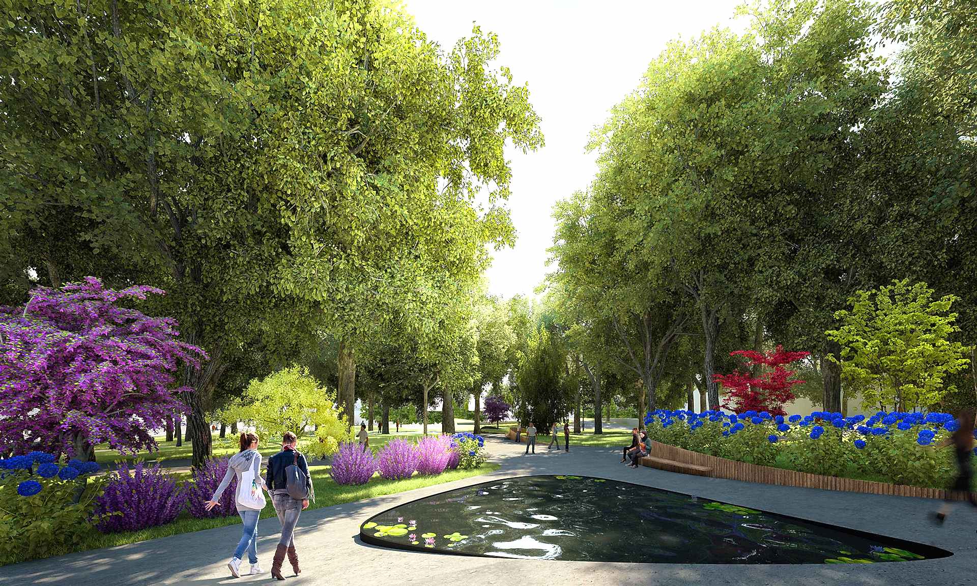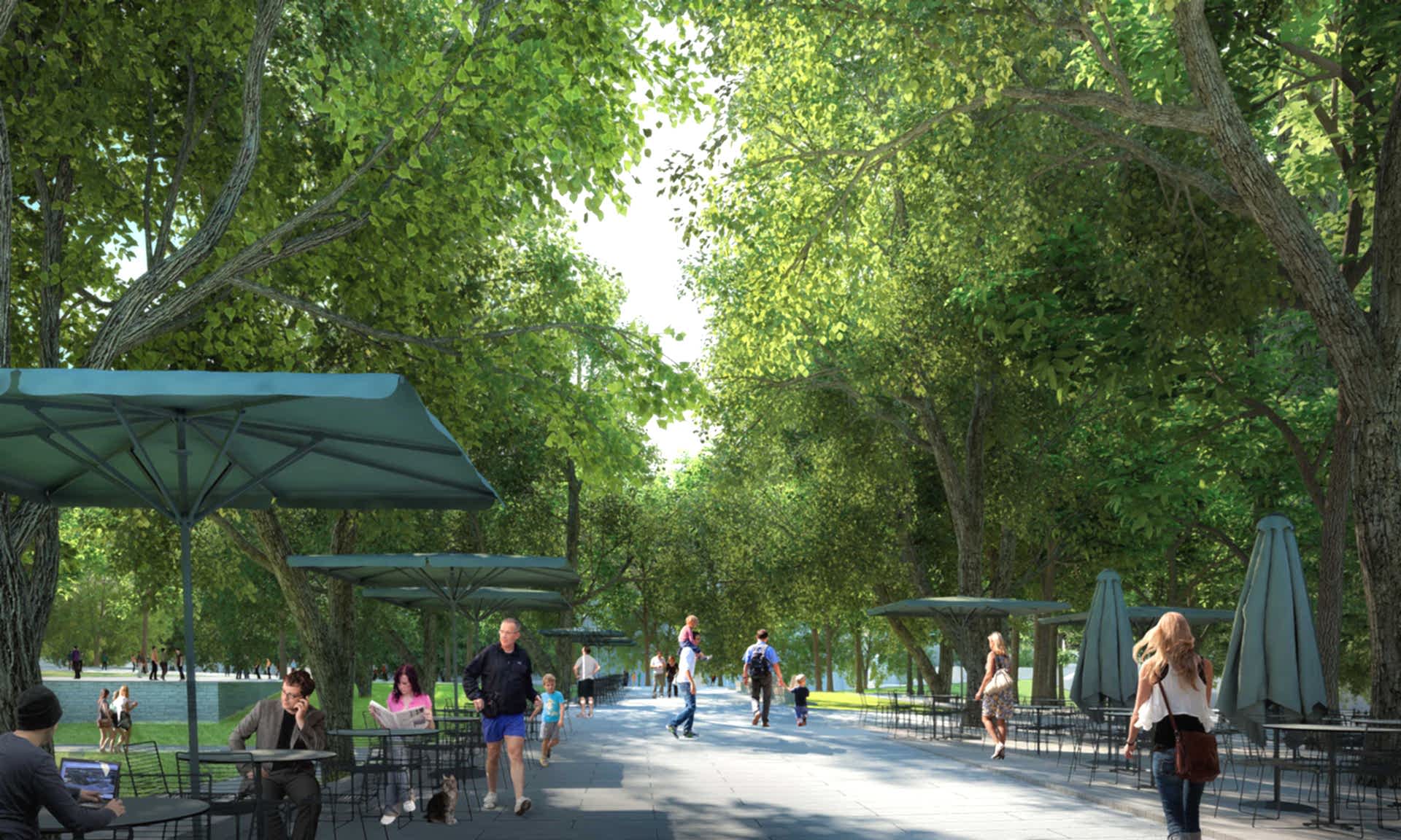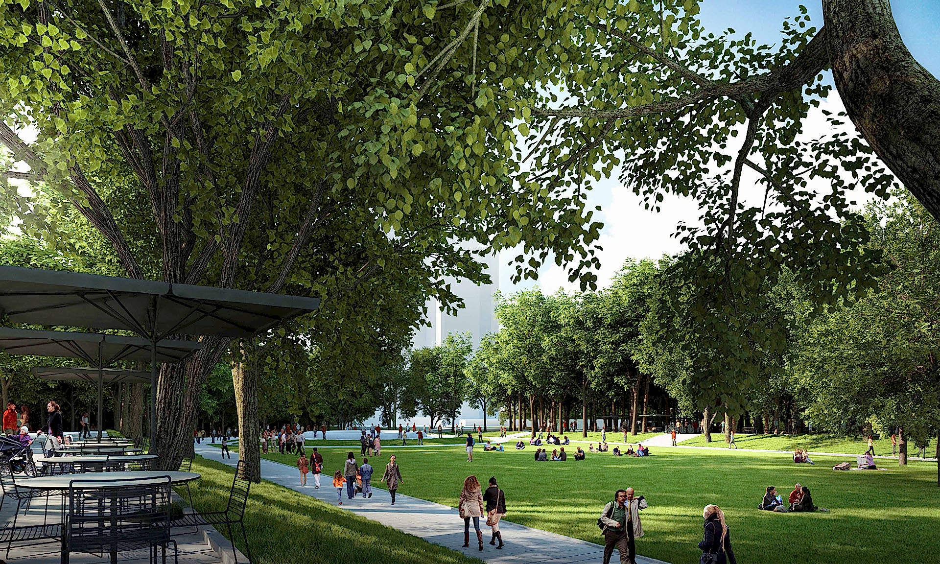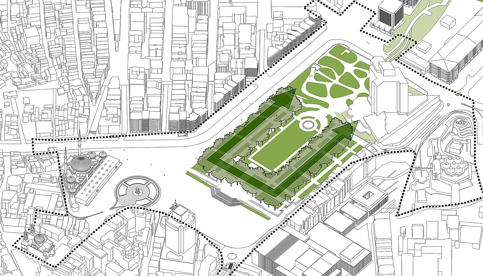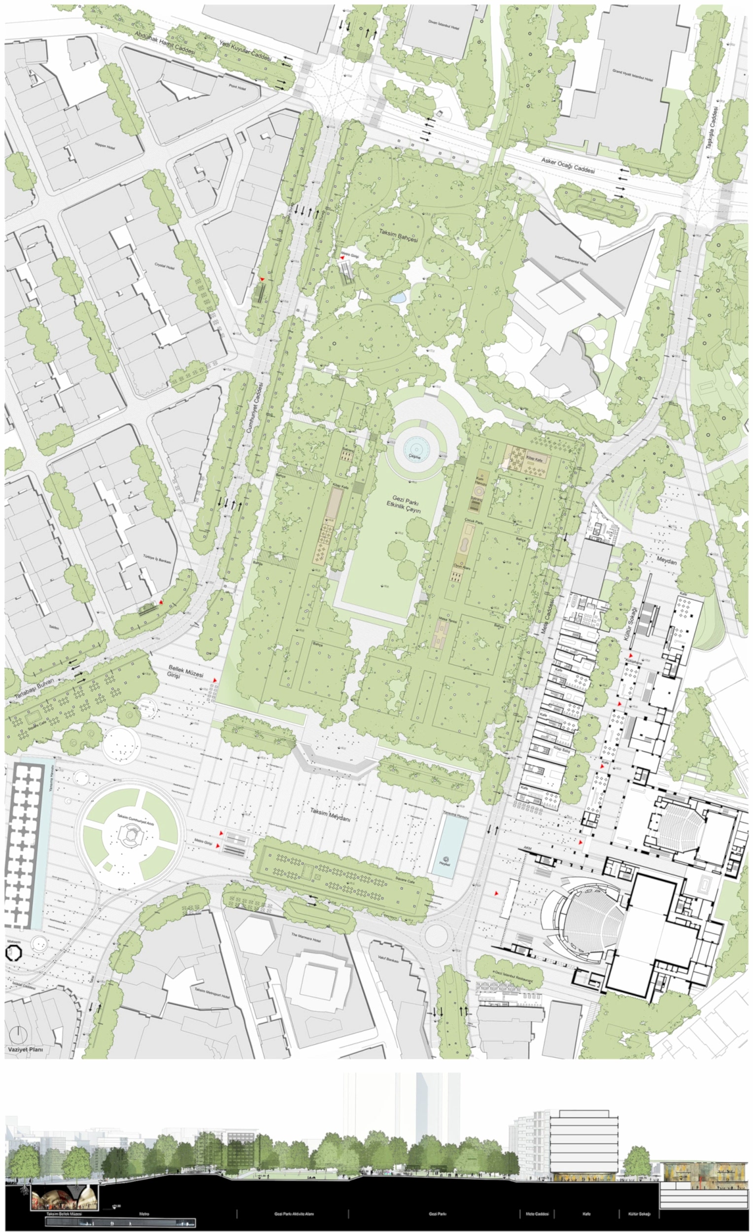 Parkın çökük -alt –mekanı buradaki mevcut ağaçlar taşınarak çim peyzajıyla çeşitli etkinliklerin yapılacağı bir kent çayırına dönüştürülmüştür. Yaz geceleri açık hava sinema gösterimlerinin yapılacağı, konserlerin verileceği, sergi ve panayırların düzenlenip, çocukların top koşturup oynayacakları, kışın buz pistine dönüşecek bu çayır, yıkılana kadar avlusunda futbol maçları oynanıp, konserler verilen kışlanın Taksim Stadı diye anıldığı günlere bir göndermedir. Parkın sonunda yer alan Taksim Bahçesi, 1910 yılından bugüne ulaşabilmiş bir kent yeşilidir. 19.yüzyılda yapılaşmaya başlayan bölgenin konut alanları için tasarlanmış bu park, Prost’un planında Gezi Parkı peyzaj karakterinin dışında tutularak orijinal haline göre, kıvrımlı yollarla, serbest düzende tasarlanmıştır. Bu proje de aynı yaklaşım benimsenerek Taksim Bahçesi için mevcut ağaç varlığı korunarak organik bir peyzaj dili önerilmektedir. 1949’da Harbiye’den gelen yeşil aksı ve yayayı Taksim Bahçesi’ne bağlamak üzere inşa edilmiş yaya köprüsü proje kapsamında bir yeşil ulaşım ve manzara koridoru olarak değerlendirilmiş, köprünün parkla bağlantı rampaları yeniden düzenlenmiştir.
