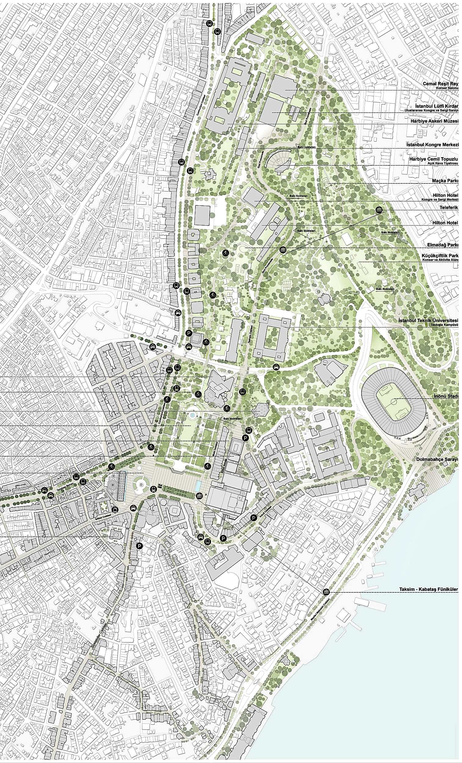 Park Maçka’dan Taksim’e uzanan kent yeşilinin Taksim Meydanı ile buluştuğu noktadır. 1937 tarihli nazım planda Prost Taksim Kışlası’nın yıkılmasıyla ortaya çıkan büyük alanda, Taksim Meydanı’na açılan bir teras ve bunun devamında bir gezi parkı (esplanad) düzenlemiştir. Parkın girişindeki basamaklar ve bu basamaklarla yükseltilmiş olan geniş teras, hem meydanda yapılacak olan törenleri izlemeye yönelik olarak hem de parka anıtsal bir giriş oluşturacak biçimde tasarlanmıştır. Girişin iki yanında rampalar yer alır. Önerilen projede parkın Taksim Meydanı bağlantısı Prost’un planına göre düzenlenmiştir. Parkın girişi hem parka açılan bir teras hem de konser, miting gibi meydandaki çeşitli etkinliklerde kullanılacak sahnedir. Topçu Kışlası’nın mekânsal izi parkı çepeçevre saran sık ve yüksek ağaçlarla bellekteki yerini alırken aynı zamanda Taksim Meydanı’nı mekânsal olarak tanımlar. Parkın üst –giriş- kotu esplanad biçiminde geometrik olarak düzenlenmiş bir gezi, panorama terası ve etkinlik alanıdır. Kafelerin, açık hava kütüphanelerinin, satranç, masa tenisi, çocuk oyun alanlarının açık sergilerin yer aldığı esplanad merdiven ve rampalarla Cumhuriyet Caddesi’ni Mete Caddesi’ne bağlar.